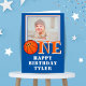 Placa de primeiro aniversario Fotográfico para Crianças de Bola ONE de Basquete. Cartão de aniversário de basquete do garoto bonito para o primeiro aniversario. O design tem uma bola de basquete na palavra UM. Adicione o nome, a foto e o dentro de mensagem do seu filho ou apague-o.