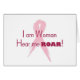 Um cartão de estímulo para o Cancer da mama. Uma fita cor-de-rosa-chica com o texto "Sou mulher a ouvir-me rugir".