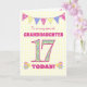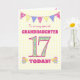 Uma carta de 17 de aniversário bonito para a sua neta, com bunting de bolinhas, flores de primata e números cheios de padrão primata, todos com um fundo amarelo pálido de gingham. A mensagem principal do cobrir é: "Para uma avó 17 muito especial HOJE!" A mensagem dentro é apenas uma sugestão e você pode personalizá-la facilmente ou excluí-la se preferir.