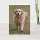 Um cartão de saudação com uma imagem fotográfica colorida de um Ouro feliz, de um cão do Retriever, trotando pela grama.