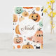 Este design de cartas bonitinho captura a magia deste marco com abóboras charmosas do Halloween, um rosto feliz de abóbora, corações e doces. É uma mistura adorável de inquietação e encantadora, perfeita para lembrar a alegria e a beleza do primeiro Dia das Bruxas do seu filho. Permita que a diversão comece com este charmoso cartão que vai espalhar sorrisos e espírito de Halloween! O nome na placa pode ser alterado.