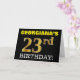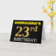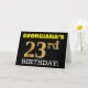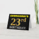 Este design de cartões de saudação de aniversário apresenta uma mensagem como "GEORGIANA'S 23rd BIRTHDAY!", com o "23º" a ter uma aparência falsa e imitada de cor dourada. O nome do destinatário na frente pode ser personalizado e o fundo frontal é preto colorido. Também apresenta uma mensagem de saudação de aniversário personalizada no dentro. Um cartão de aniversário como este poderia talvez ser dado a alguém em comemoração do seu vigésimo terceiro aniversário. [~Z0000183]