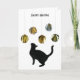 Um gato preto se espanta com enfeites de bolinhas de papel dourado neste meio século distinto estilhaçado cartão de Natal.