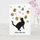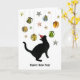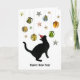 Um gato preto vestindo um chapéu vermelho se espalha pelas estrelas e pelas bolas de ouro nesta placa de Feliz ano novo estilizada com meio século distinto.