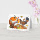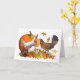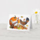 Um trio de galinhas gosta de cair rodeado de folhas de carvalho coloridas, uma grande abóbora laranja e um monte de uvas maduras neste cartão de frango do outono.