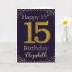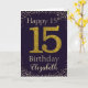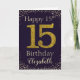 Parabéns com o número 15 simulado de brilho de ouro em uma cor sólida e emoldurado por diamantes falsos e rotinas. Feliz aniversário e nome dos destinatários em letra esbranquiçada. Personalizar com nome ou mensagem.