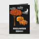 Família Pumpkin Bonita, parada por uma árvore com as Folhas de Outono Laranja em um com céu negro e lua branca e nuvens com uma mensagem de abraço de Halloween amigável no Cobrir frontal e um lugar para sua mensagem pessoal dentro.
