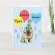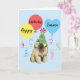 Feliz aniversário saudações com este design bonitinho com um feliz e vestido cachorrinho de Keeshond rodeado por balões e biberões coloridos. O nome pode ser facilmente alterado; basta clicar no botão personalizar.