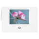 Fotografia de um ramo de macieiras com flor de maçã rosa em fundo azul/cinza.