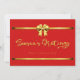 Fundo vermelho com estrelas douradas e fita dourada. Saudações da temporada escritas na frente, Convite nas costas. Nome, Datas, Local e Endereço do evento, Pessoa de contato e informações personalizáveis no verso.