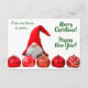A frente deste cartão de saudação de Natal apresenta uma imagem fofa de um gnomo branco com barba vestindo um chapéu vermelho de Papai Noel que cai sobre seus olhos. Ele está parado atrás de uma fileira de ouro e bolbos de árvore vermelho-claro decorados com prata. O texto verde diz "Feliz Natal!" e "Feliz ano novo!" A parte traseira da placa tem campos de texto adicionais em uma oval que é colocada sobre um plano de fundo nórdico vermelho e branco. Todo o texto, frente e verso, pode ser facilmente personalizado por você.
