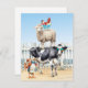 Pato, vaca, ovelha e Hen na praia enviando saudações para o feriado. Humor