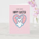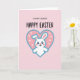 This card features a stylized white bunny centered inside a large heart, giving the scene a gentle, affectionate feel 🐰. The bunny has round features, long upright ears, and lightly rosy cheeks, as if leaning into a warm hug. A soft pastel pink background sets a calm spring setting, like a quiet moment shared between close friends. The heart around the bunny has a baby blue outline with a petal-pink interior sprinkled with small white polka dots, adding a sweet, cozy touch 🌷. At the top, the phrase “HUNNY BUNNY” appears in black, all-caps lettering, with “HAPPY EASTER” placed nearby in the same black type for a clear greeting. The text sits above the heart and bunny, leaving the central image uncluttered and easy to notice. The bunny’s white fur contrasts against the pink backdrop, and the heart’s blue border neatly frames the pink, dotted center.