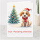 Uma bela cena de Natal com um filhote adorável vestindo um chapéu de Papai Noel e um cachecol vermelho sentados alegremente ao lado de uma árvore de Natal.