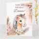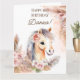 Cartaz de cavalo com cartão de cumprimentos de aniversário com flores de bolo pastel, cartão de festa de aniversário com tema de cavalo, cartão de aniversário para amantes de cavalos. Boho pampas rosa cores castanho pastel para festa de aniversário com tema feminino, cavalo bebê fofo.