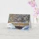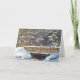 O cartão comemorativo apresenta uma foto digitalmente manipulada da ponte de madeira na neve com árvores verdes atrás. dentro vazio.