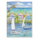 Os pelicanos sobem apreciando grandes vistas do ar de uma vila de beira-mar brilhante. :: Aguarela original por Barbara Bayer