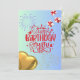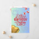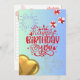 Frente: a placa tem um fundo azul claro. No centro, há um grande texto vermelho que lê "Parabéns para você", decorado com estrelas brancas e vermelhas. Acima do texto, há dois fogos de artifício brancos, e espalhados ao redor estão estrelas pequenas. À direita, há duas caixas-presentes com fitas vermelhas, e no canto inferior esquerdo, há um balão em forma de ouro. Back: Há uma caixa de presentes e ursos de pelúcia falsamente impressos, juntamente com as frases "desejamos o melhor" e "faça um desejo e comemore seu dia especial" em uma fonte elegante.