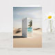 Uma porta fica aberta no meio do deserto, revelando uma cena de praia exuberante com uma palmeira e oceano.