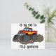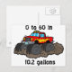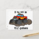 Um desenho animado de um caminhão com pneus grandes rasgando a sujeira. As palavras 0 a 60 em 10,2 galões ao redor dele. Vamos pelo menos tentar conservar nossas reservas de gasolina.