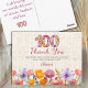 Send a heartfelt note after her 100th with this elegant floral thank you postcard. A soft linen-look background, floral-filled “100” and watercolor wildflowers in pink, orange and purple coordinate perfectly with the Wildflower one hundredth party invitation. Personalize the name and message to thank friends and family for making this milestone birthday so special. Enjoy!