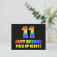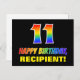 A frente deste design de cartão postal de aniversário divertido, colorido e alegre apresenta um grande número "11" e a mensagem "FELIZ ANIVERSÁRIO", ambos tendo um gradiente de padrão inspirado no espectro do arco-íris, juntamente com um nome ousado de destinatário personalizável amarelo. A frente também apresenta um fundo preto, simples e minimalista. A parte de trás do cartão postal tem uma mensagem de saudação de aniversário personalizada, ou talvez pudesse ser apagada e deixada em vazio se uma mensagem fosse escrita manualmente. Um cartão postal de aniversário vibrante e personalizável como este pode ser uma maneira divertida de reconhecer o décimo primeiro aniversário de alguém. [~Z0000474]