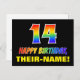 A frente deste design de cartão postal colorido, alegre e divertido aniversário com tema de aniversário apresenta um grande número "14" e a mensagem "FELIZ ANIVERSÁRIO", ambos tendo um gradiente de padrão inspirado no espectro do arco-íris, juntamente com um nome ousado de destinatário personalizado amarelo. A frente também tem um fundo preto claro. A parte de trás do cartão postal contém uma mensagem de saudação de aniversário editável, ou talvez pudesse ser apagada e deixada em vazio se uma mensagem fosse escrita manualmente. Um interessante e personalizável cartão postal de aniversário como este pode ser uma maneira divertida de reconhecer o décimo quarto aniversário de alguém. [~Z0000474]