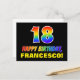A frente deste design de cartão postal de aniversário divertido, colorido e alegre apresenta um grande número "18" e a mensagem "FELIZ BIRTHDAY", ambos tendo um gradiente do espectro do arco-íris inspirado na coloração de padrões, juntamente com um nome de destinatário personalizado amarelo ousado. A frente também apresenta um fundo preto, claro e minimalista. A parte de trás do cartão postal tem uma mensagem de saudação de aniversário personalizada, ou talvez pudesse ser apagada e deixada em vazio se uma mensagem fosse escrita manualmente. Um postal de aniversário vibrante e personalizável como este pode ser uma maneira divertida de celebrar o 18º aniversário de alguém. [~Z0000474]