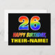 A frente deste design de cartão postal de aniversário divertido, alegre e colorido apresenta um grande número "26" e a mensagem "FELIZ BIRTHDAY", ambos coloridos com um padrão inspirado no gradiente do espectro do arco-íris, juntamente com um nome ousado de destinatário personalizado amarelo. A frente também tem um fundo preto, claro e mínimo. A parte de trás do cartão postal contém uma mensagem de saudação de aniversário personalizável, ou talvez possa ser apagada e deixada em vazio se uma mensagem for escrita manualmente. Um cartão de aniversário personalizável e alegre como este pode ser uma forma divertida de celebrar o vigésimo sexto aniversário de alguém. [~Z0000474]