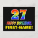 A frente deste design de cartão postal animado, divertido e colorido com tema de aniversário apresenta um grande número "27" e a mensagem "FELIZ BIRTHDAY", ambos coloridos com um padrão inspirado no gradiente do espectro do arco-íris, juntamente com um nome ousado de destinatário personalizado amarelo. A frente também tem um fundo preto minimalista. A parte de trás do cartão postal tem uma mensagem de saudação de aniversário personalizada, ou talvez pudesse ser apagada e deixada em vazio se uma mensagem fosse escrita manualmente. Um postal de aniversário personalizado vibrante como este pode ser uma maneira divertida de celebrar o vigésimo sétimo aniversário de alguém. [~Z0000474]