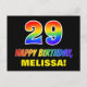 A frente deste design de cartão postal de aniversário divertido, colorido e alegre apresenta um grande número "29" e a mensagem "FELIZ BIRTHDAY", ambos tendo um gradiente de padrão inspirado no espectro do arco-íris, juntamente com um nome de destinatário personalizável amarelo ousado. A frente também apresenta um simples fundo preto. A parte de trás do cartão postal contém uma mensagem de saudação de aniversário personalizada, ou talvez possa ser apagada e deixada em vazio se uma mensagem for escrita manualmente. Um postal de aniversário vibrante como este pode ser uma maneira divertida de enviar desejos de aniversário a alguém que comemora seu vigésimo nono aniversário. [~Z0000474]