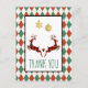 Um cartão postal de Natal que diz "Obrigado" na frente e tem uma mensagem personalizada no verso. Projetado com uma ilustração de 2 veados de Natal saltando. Os veados são feitos de xadrez de lenhador vermelho e preto, com um pequeno coração entre eles. Decorações de Natal com brilho dourado falso pendem do topo. O fundo é um padrão de argila vermelha e verde.