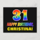 A frente deste design de cartão postal colorido, divertido e alegre, com tema de aniversário, apresenta um grande número "31" e a mensagem "FELIZ BIRTHDAY", ambos coloridos com um padrão inspirado no gradiente do espectro do arco-íris, juntamente com um nome de destinatário ousado, amarelo editável. A frente também tem um fundo simples, claro e preto. A parte de trás do cartão postal tem uma mensagem de saudação de aniversário personalizada, ou talvez possa ser apagada e deixada em vazio se uma mensagem for escrita manualmente. Um cartão postal animado de aniversário personalizado como este pode ser uma maneira divertida de enviar uma mensagem celebrando o trinta primeiro aniversário de alguém. [~Z0000474]