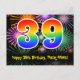 A frente deste emocionante, divertido e colorido design de cartão postal temático de aniversário apresenta um grande número "39" com um padrão inspirado no gradiente do espectro do arco-íris, juntamente com a mensagem "Feliz Aniversário de 39 anos" e um nome de destinatário personalizável. A frente também apresenta um padrão de fundo colorido e vibrante inspirado na aparência de fogos de artifício comemorativos estourando. O verso apresenta uma mensagem de aniversário editável, ou talvez possa ser limpo e deixado em branco se uma mensagem for escrita à mão. Um cartão postal de aniversário personalizado como este pode ser uma maneira divertida de celebrar o 39º aniversário de alguém. Cartões postais como este também podem ser usados para convidar convidados para uma celebração de aniversário realizada para alguém que está completando 39 anos de idade.