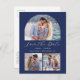 Este cartão postal, simples e minimalista Save the Date (Salvar a data), apresenta uma fotografia em forma de arco no topo e duas fotos quadradas menores no fundo. No meio, as palavras "Salvar a Data" aparecem no elegante guião branco, seguido dos nomes do casal, da data do casamento e da cidade em sans serif em um fundo azul marinho. Adicione seu endereço de devolução e detalhes adicionais no verso.
