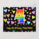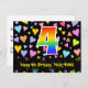 A frente deste design de cartão de aniversário empolgante, colorido e divertido apresenta um grande número "4" com um padrão inspirado no gradiente do espectro arco-íris, juntamente com a mensagem "Feliz 4º aniversário", e um nome de destinatário personalizado. A frente também apresenta um padrão colorido e vibrante de corações amorosos. A parte traseira apresenta uma mensagem de saudação de aniversário personalizada, ou talvez possa ser apagada e deixada em vazio se uma mensagem for escrita manualmente. Um postal de aniversário como este pode ser uma maneira divertida de enviar desejos de aniversário a alguém que comemora seu quarto aniversário. Cartões postais como este também podem ser usados para convidar hóspedes para uma festa de aniversário que está sendo mantida para alguém que está fazendo 4 anos de idade. [~Z0000448]