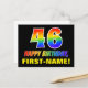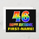 A frente deste design de cartão postal animado, colorido e divertido, com tema de aniversário, apresenta um grande número "46" e a mensagem "FELIZ BIRTHDAY", ambos tendo um gradiente de padrão inspirado no espectro do arco-íris, juntamente com um nome de destinatário personalizado amarelo ousado. A frente também apresenta um plano de fundo preto claro. A parte de trás do cartão postal contém uma mensagem de saudação de aniversário personalizada, ou talvez pudesse ser apagada e deixada em vazio se uma mensagem fosse escrita manualmente. Um cartão postal de aniversário personalizado emocionante como este pode ser uma maneira divertida de reconhecer o quarenta e sexto aniversário de alguém. [~Z0000474]