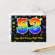 A frente deste emocionante, divertido e colorido design de cartão postal temático de aniversário apresenta um grande número "53" com um padrão de gradiente de espectro de arco-íris, juntamente com a mensagem "Feliz Aniversário de 53 anos," e um nome de destinatário personalizável. A frente também apresenta um fundo colorido e vibrante com um padrão de formas de estrelas. A parte traseira apresenta uma mensagem de saudação de aniversário personalizável ou pode ser limpada e deixada em branco se uma mensagem for escrita à mão. Um cartão postal de aniversário personalizável como este pode ser uma maneira divertida de enviar uma mensagem em celebração do aniversário de cinquenta e três anos de alguém. Cartões postais como este também podem ser usados para convidar convidados para uma festa de aniversário realizada para alguém que está completando 53 anos. [~Z0000447]