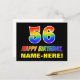 A frente desta divertida, alegre e colorida design de cartão postal com tema de aniversário apresenta um grande número "56" e a mensagem "FELIZ BIRTHDAY", ambas coloridas com um padrão inspirado no gradiente do espectro do arco-íris, juntamente com um nome ousado de destinatário personalizado amarelo. A frente também tem um fundo preto minimalista. A parte de trás do cartão postal contém uma mensagem de saudação de aniversário personalizada, ou talvez pudesse ser apagada e deixada a vazio se uma mensagem fosse escrita manualmente. Um cartaz de aniversário personalizado empolgante como este pode ser uma maneira divertida de celebrar o cinquenta e sexto aniversário de alguém. [~Z0000474]