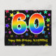 O verso deste design de cartão postal de aniversário divertido, emocionante e colorido apresenta um grande número "60" com um padrão de gradiente de espectro de arco-íris. Ele também apresenta a mensagem "Feliz 60º Aniversário," e um nome de destinatário editável. A frente também tem um padrão de fundo com formas de estrelas coloridas e vibrantes. O verso apresenta uma mensagem de saudação de aniversário personalizada, ou talvez possa ser limpo e deixado em branco se uma mensagem for escrita à mão. Um cartão postal de aniversário personalizável como este pode ser uma maneira divertida de reconhecer o aniversário de alguém de sessenta anos. Cartões postais como este também podem ser usados para convidar convidados para uma celebração de aniversário ou festa que está sendo realizada para alguém que está completando 60 anos de idade.