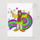 Sessenta anos de estilo hippie com seu cabelo longo, sandles e camisa tingida. Ele tem uma barba e uma banda de cabeça e está segurando ambas as mãos para mostrar o sinal de paz. As cores giratórias estão atrás dele e as estrelas e outras formas giram acima.