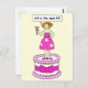 Uma glamourosa senhora de desenho animado em um grande bolo e vestindo um vestido rosa sem fio. Ela segura um coquetel com uma mão e diz que "64 é o novo 44".