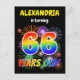 A frente deste design postal de convite de aniversário divertida e vibrante apresenta um nome editável, um padrão inspirado em fogos de artifício celebratórios e animado, e a mensagem "66 ANOS DE IDADE!" tendo um espectro colorido do arco-íris inspirou um padrão de gradação. A parte traseira apresenta uma mensagem editável que pode incluir detalhes sobre a festa de aniversário, como quando ela está acontecendo e onde ela está sendo mantida. Cartões-postais como este podem ser enviados a potenciais participantes de uma festa de aniversário que está a ser realizada para celebrar o sexagésimo sexto aniversário de alguém. [~Z0000452]