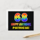 A frente desse design de cartão postal animado, divertido e colorido aniversário com tema de aniversário apresenta um grande número "68" e a mensagem "HAPPY BIRTHDAY", ambas coloridas com um padrão inspirado no gradiente do espectro do arco-íris, juntamente com um nome de destinatário personalizável amarelo ousado. A frente também apresenta um simples fundo preto. A parte de trás do cartão postal contém uma mensagem de saudação de aniversário personalizada, ou talvez possa ser apagada e deixada em vazio se uma mensagem for escrita manualmente. Um cartão postal de aniversário personalizável como este pode ser uma maneira divertida de celebrar o 68º aniversário de alguém. [~Z0000474]