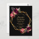 Na frente: Um convite para uma festa de aniversário elegante. Um fundo preto chic com uma falsa estrutura geométrica dourada. Decorados com flores, rosas e penas de tipo vassoura, escuras e cor-de-rosa, de cor-d'água. Modelos para um nome e detalhes da festa. O nome é escrito com um script de estilo manuscrito, letras ouros coloridas. Fundo branco.