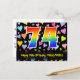 A frente deste emocionante, colorido e divertido design de cartão postal temático de aniversário apresenta um grande número "74" com um padrão inspirado em gradiente de espectro de arco-íris. Também apresenta a mensagem "Feliz Aniversário de 74 anos," e um nome de destinatário personalizável. A frente também apresenta um padrão de fundo vibrante e colorido com corações amorosos de diferentes tamanhos. A parte de trás apresenta uma mensagem de saudação de aniversário personalizada, ou talvez possa ser limpada e deixada em branco se uma mensagem for escrita à mão. Um cartão postal de aniversário personalizado como este pode ser uma maneira divertida de celebrar o aniversário de setenta e quatro anos de alguém. Cartões postais como este também podem ser usados para convidar convidados para uma festa de aniversário ou celebração que está sendo realizada para alguém que está completando 74 anos de idade.