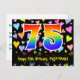 A frente deste emocionante, colorido e divertido design de cartão postal de aniversário apresenta um grande número "75" com um padrão inspirado em gradiente de espectro de arco-íris. Também apresenta a mensagem "Feliz Aniversário de 75 anos," e um nome de destinatário personalizado. A frente também tem um padrão colorido e vibrante de corações amorosos. A parte de trás apresenta uma mensagem de aniversário personalizada, ou talvez possa ser limpa e deixada em branco se uma mensagem for escrita à mão. Um cartão postal de aniversário personalizado como este pode ser uma maneira divertida de enviar uma mensagem em celebração do aniversário de setenta e cinco anos de alguém. Cartões postais como este também podem ser usados para convidar convidados para uma festa de aniversário ou celebração que está sendo realizada para alguém que está completando 75 anos de idade.