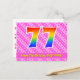 A frente deste design de cartão postal de aniversário alegre, animado e amoroso apresenta um grande número "77" com um padrão de gradiente de espectro de arco-íris. Também apresenta a mensagem "Feliz Aniversário de 77 anos," e um nome de destinatário editável. A frente também apresenta um padrão alegre de formas de coração em rosa escuro e rosa claro e listras. A parte de trás apresenta uma mensagem de saudação de aniversário editável, ou talvez possa ser limpa e deixada em branco se uma mensagem for escrita à mão. Um cartão postal de aniversário personalizado como este pode ser uma maneira divertida de celebrar o aniversário de alguém de setenta e sete anos. Cartões postais como este também podem ser usados para convidar convidados para uma festa de aniversário ou celebração que está sendo realizada para alguém que está completando 77 anos de idade.