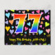 A frente deste design de cartão postal de aniversário amoroso, divertido e emocionante apresenta um grande número "77" com um padrão de gradiente de espectro de arco-íris, juntamente com a mensagem "Feliz Aniversário de 77 anos", e um nome de destinatário personalizável. A frente também tem um fundo vibrante e colorido com um padrão de corações amorosos. A parte traseira apresenta uma mensagem de saudação de aniversário personalizada ou pode ser limpada e deixada em branco se uma mensagem for escrita à mão. Um cartão postal de aniversário personalizado como este pode ser uma maneira divertida de enviar uma mensagem em celebração do septuagésimo sétimo aniversário de alguém. Cartões postais como este também podem ser usados para convidar convidados para uma festa de aniversário realizada para alguém que está completando 77 anos.