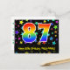 A frente deste design de cartão postal colorido, emocionante e divertido com tema de aniversário apresenta um grande número "87" com um padrão de gradiente de espectro de arco-íris, juntamente com a mensagem "Feliz Aniversário de 87 anos", e um nome de destinatário personalizável. A frente também apresenta um padrão de fundo de formas de estrelas coloridas e vibrantes. A parte traseira apresenta uma mensagem de saudação de aniversário personalizável, ou talvez possa ser limpada e deixada em branco se uma mensagem for escrita à mão. Um cartão postal de aniversário como este pode ser uma maneira divertida de enviar desejos de aniversário para alguém que está celebrando seu aniversário de 87 anos. Cartões postais como este também podem ser usados para convidar convidados para uma celebração de aniversário realizada para alguém que está completando 87 anos de idade.